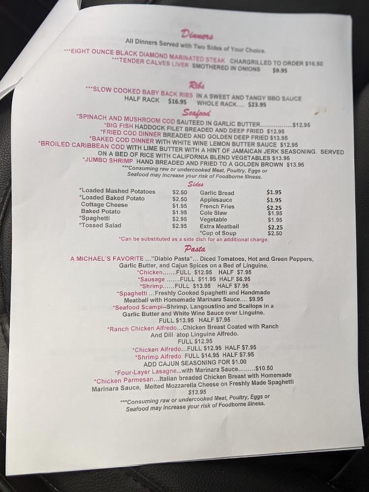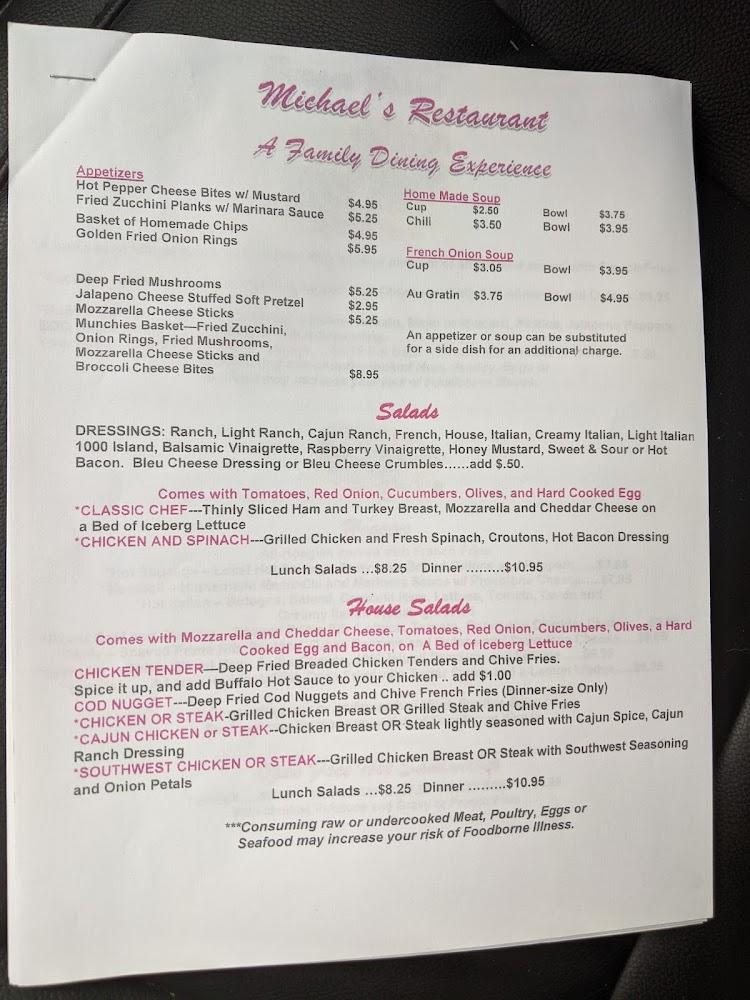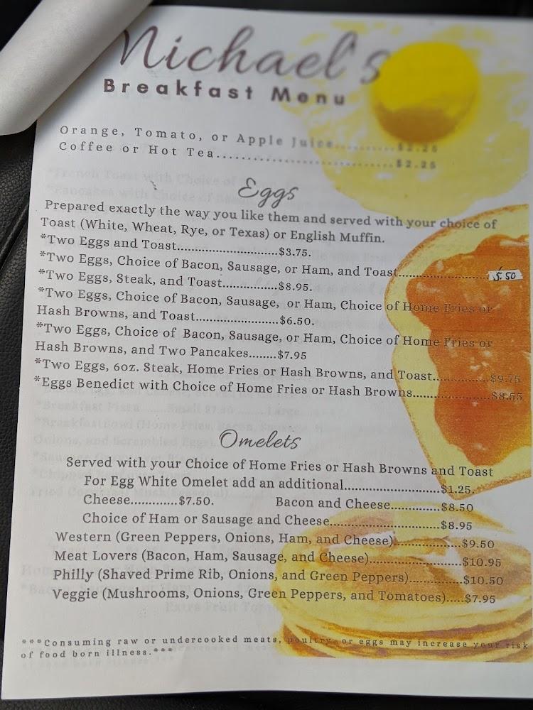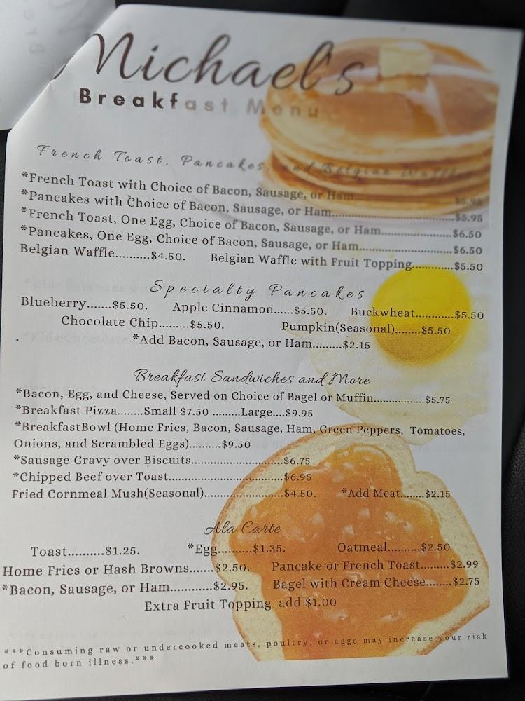 Michael's Restaurant features a well-rounded menu, appealing to diverse tastes. Breakfast options range from omelets to specialty pancakes, ensuring something for everyone. Lunch and dinner include sandwiches, seafood, and hearty meals like meatloaf or gyros.